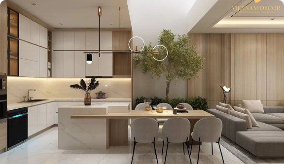 Ví dụ: Sàn gỗ nâu nhạt kết hợp bàn ghế gỗ nâu đậm tạo sự đồng bộ nhưng vẫn có lớp lang.